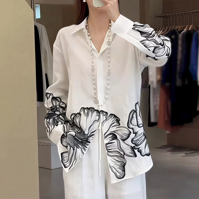 Ink print light retro new style white sleeve women's shirt