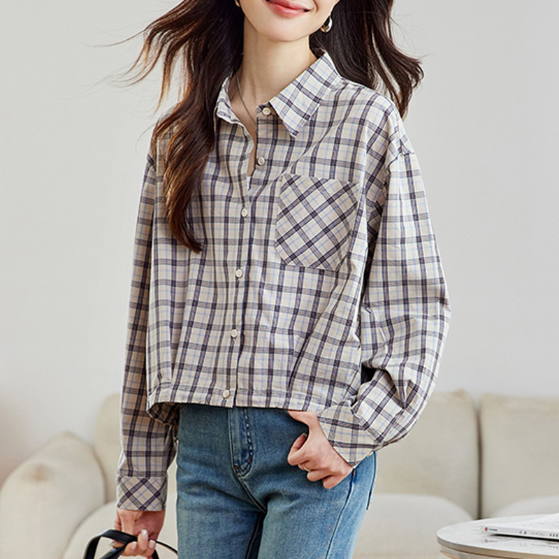 Plaid short style, green style, loose new style, women's shirt with sleeves