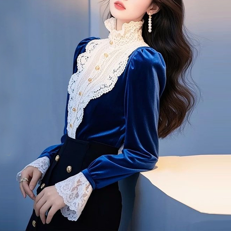 New style women's shirt with contrasting lace stitching standing collar and velvet sleeves
