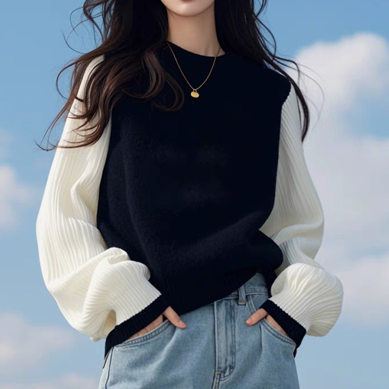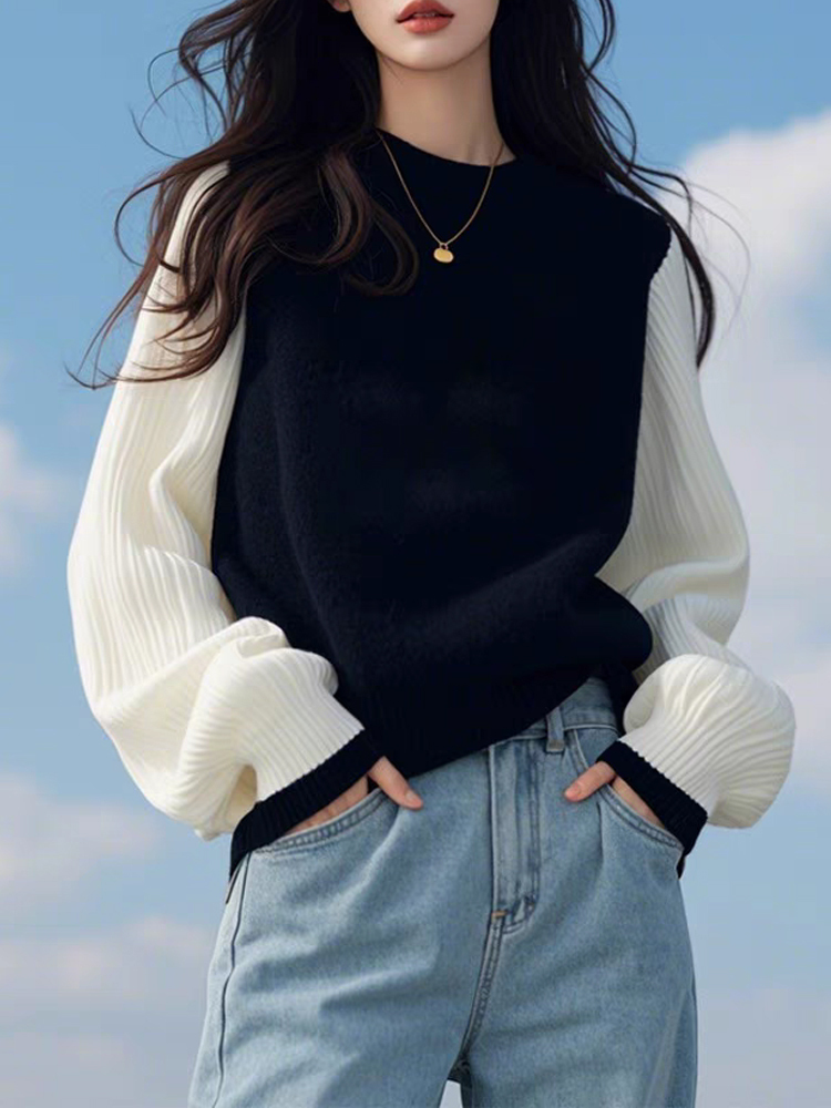 Black and white contrast color lazy loose pullover sweater