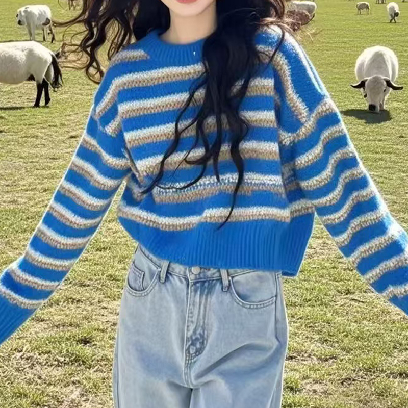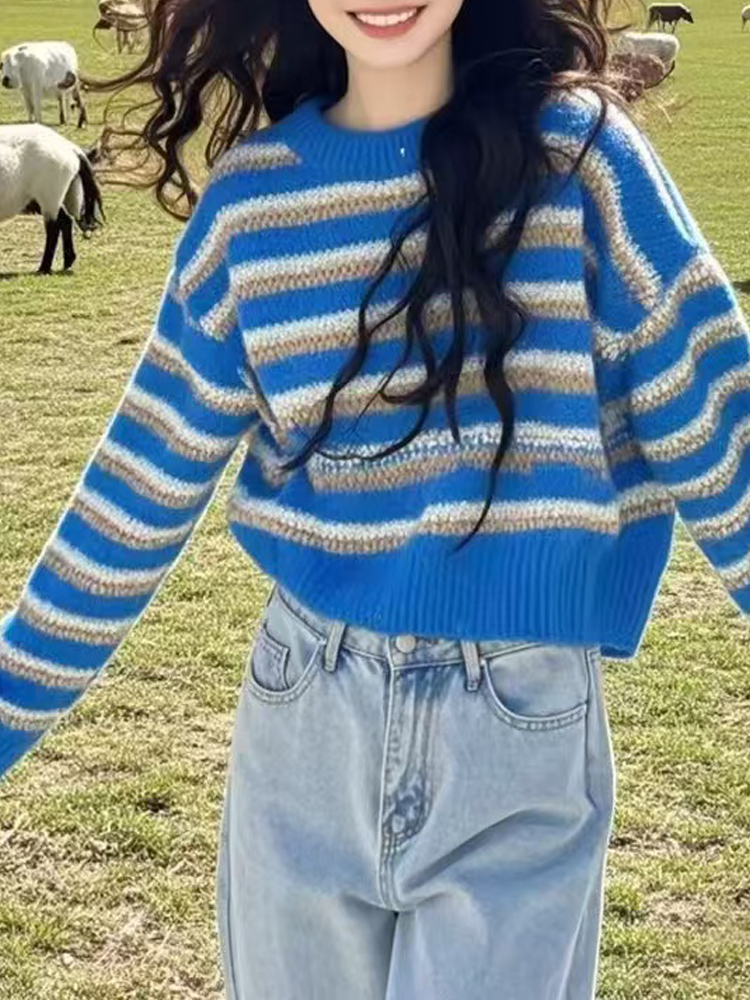 Blue striped short loose pullover sweater