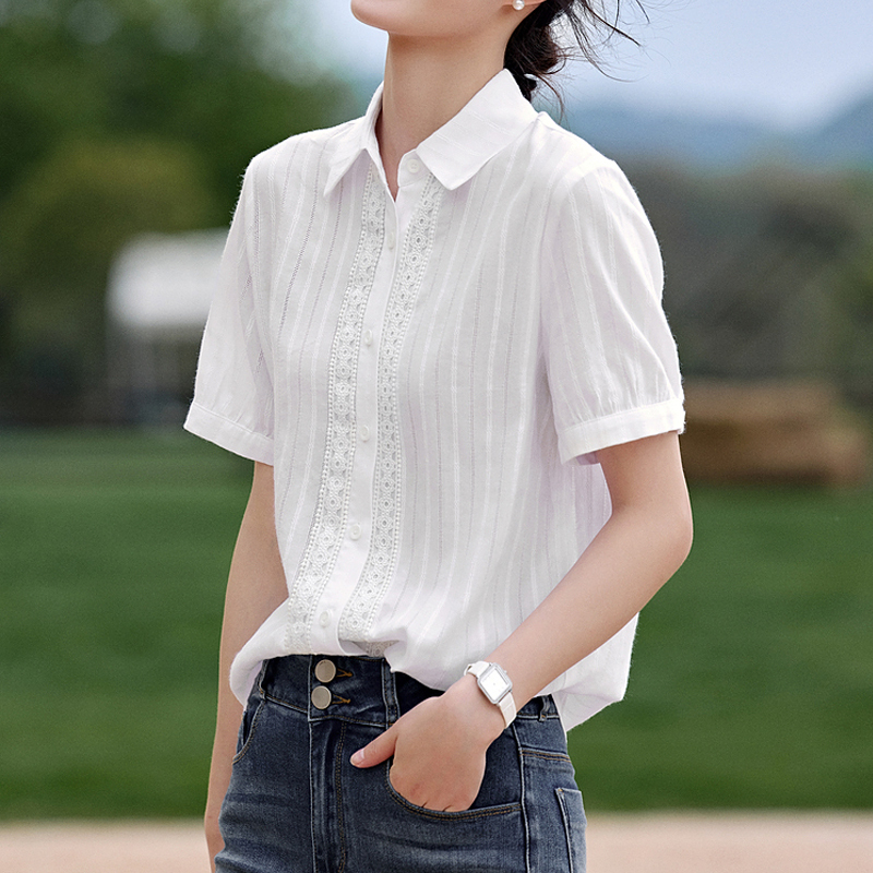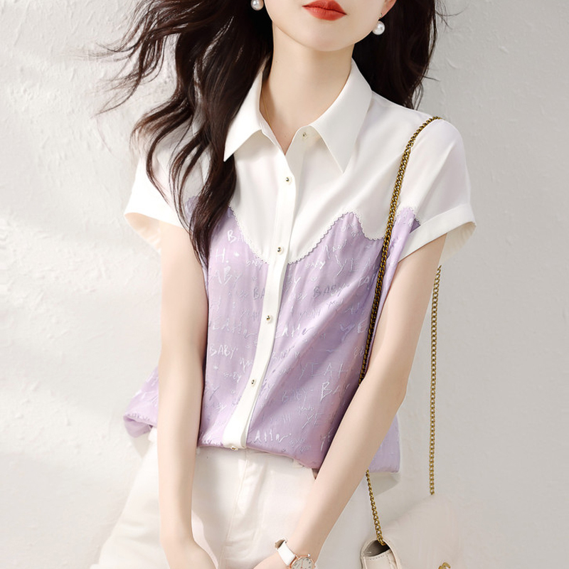 Commuting webbing spliced white short-sleeved blouse