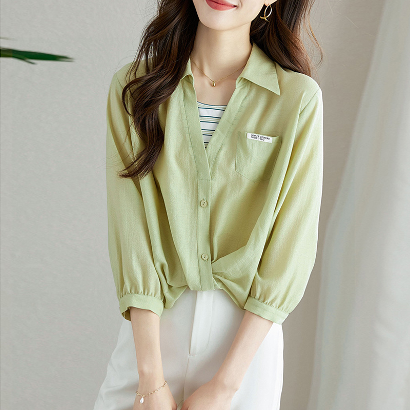 Fake two knotted green long-sleeved blouses