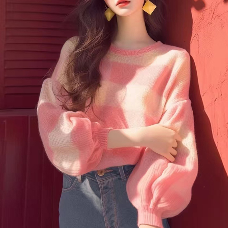 Lazy style pink big stripe lantern sleeves women's sweater