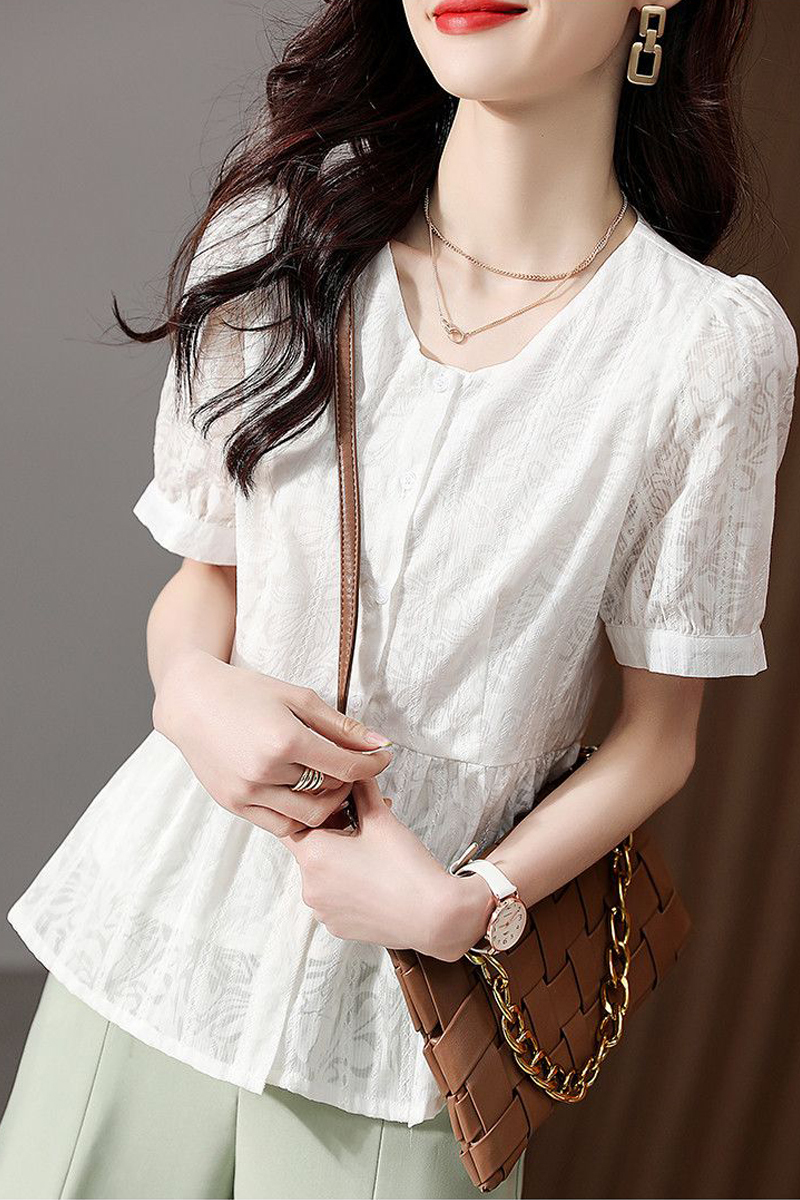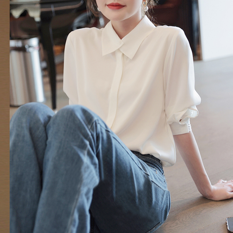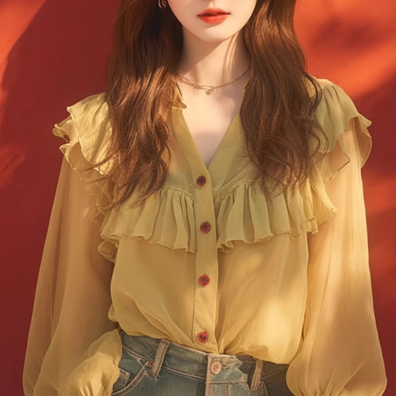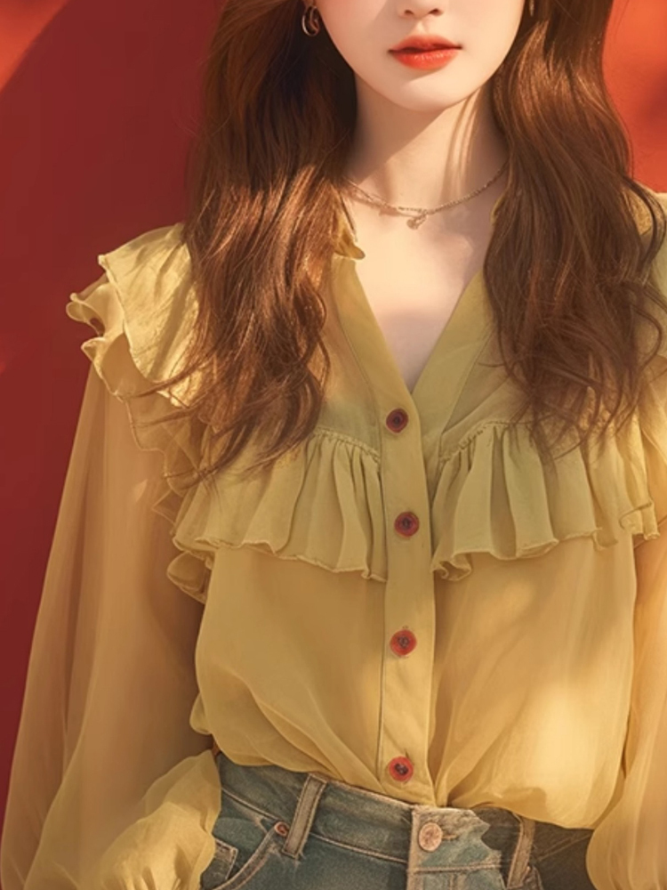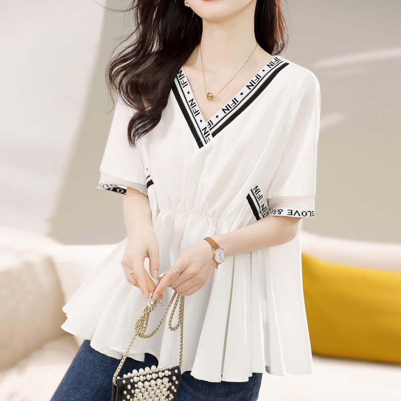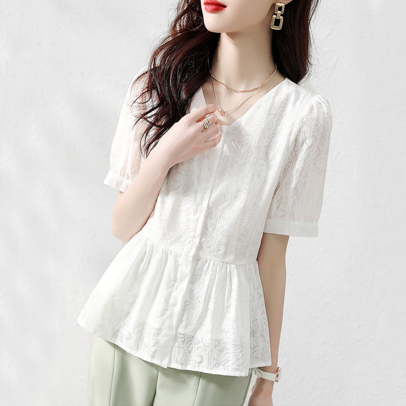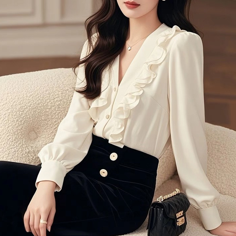Elegant ruffled V-neck white new style women's shirt with sleeves
