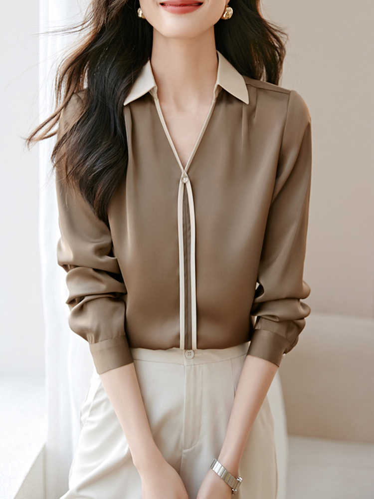 Temperament commuting contrasting V-neck pullover sleeves blouse
