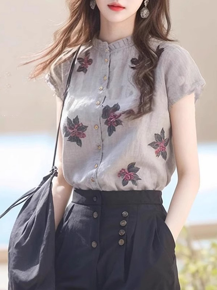 French gentle style new style three-quarter sleeve printed pullover round collar women's shirt