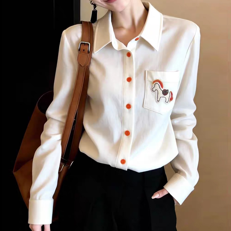 Design pony pattern patch bag, white contrast color button sleeves, blouse