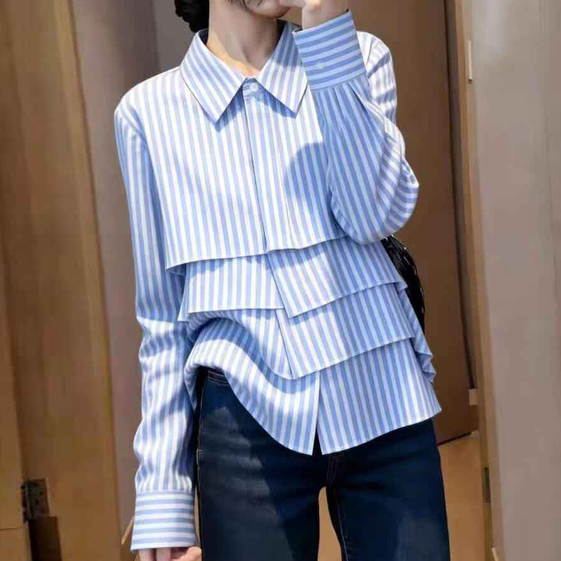 Navy blue spliced stripe temperament shows thin long-sleeved shirt