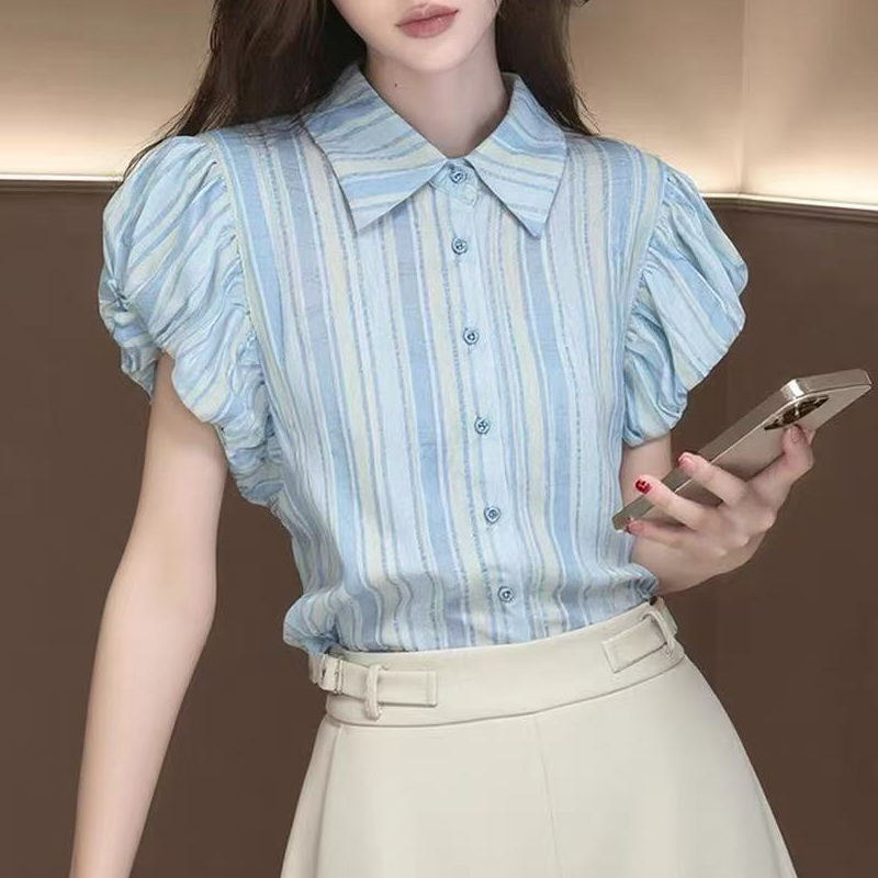 Blue stripe age-reducing bubble sleeves summer short-sleeved women's shirt