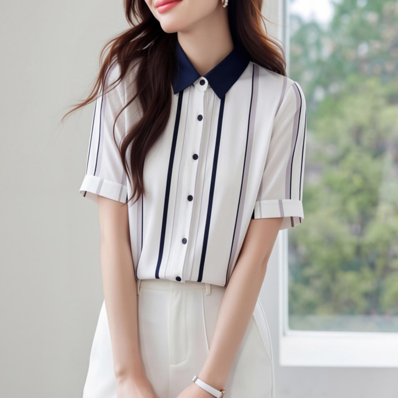 Contrasting color lapel stripe new commuter summer short-sleeved women's shirt and top