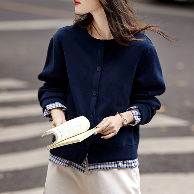 Plaid splicing fake two-piece loose navy blue autumn and winter women's sweater