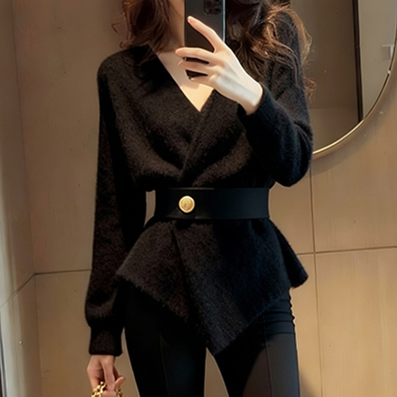 Winter new black V-neck asymmetrical plush sleeve sweater