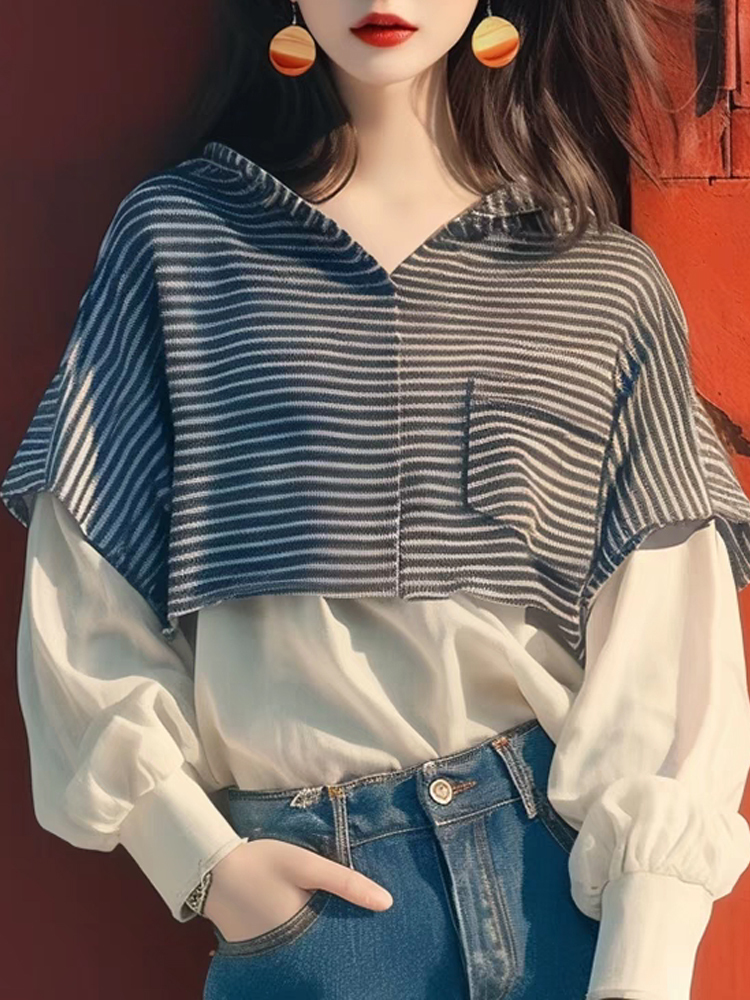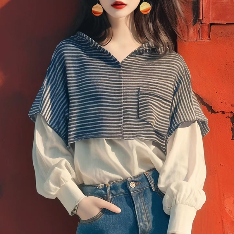 Design sense, fungus edge stitching and contrasting color fake two-piece blouse