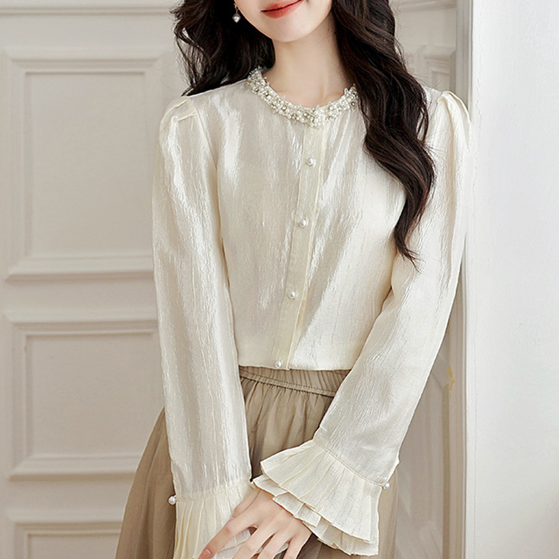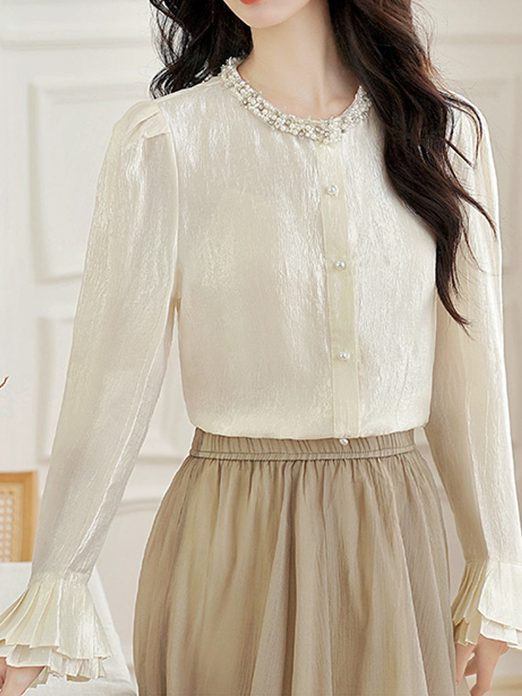 Design beaded neckline micropleated sleeves apricot sleeve blouse