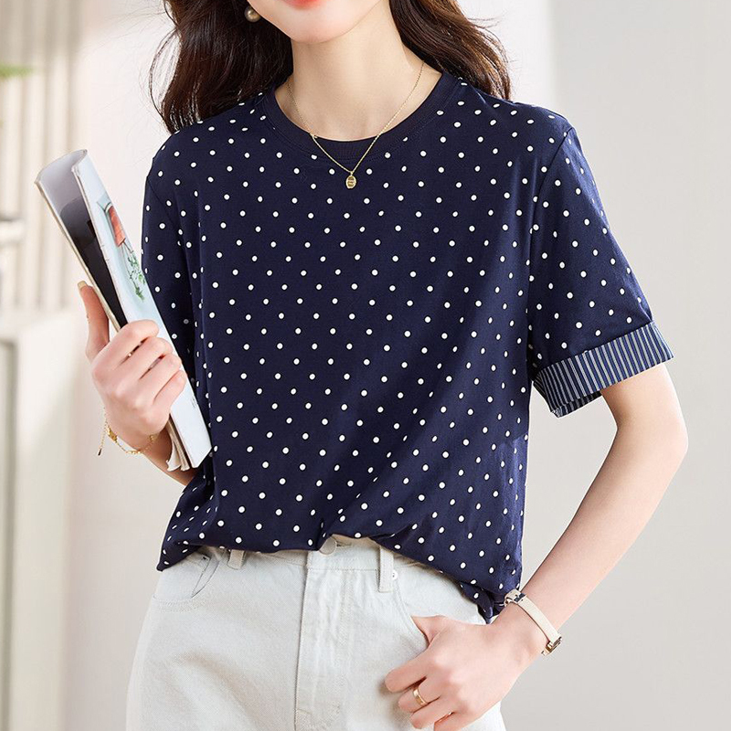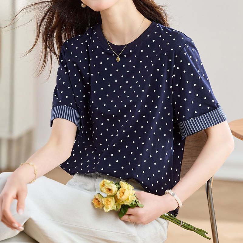Summer blue polka dot reverse folding sleeve pullover short-sleeved women's shirt