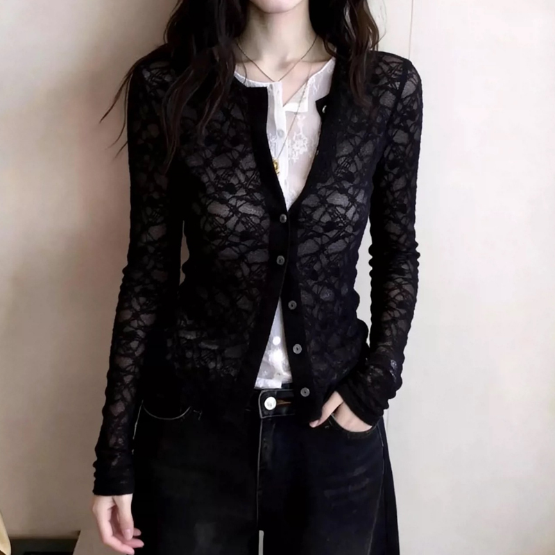 Lace stitching and micro-transparent collar black velvet sleeve blouse