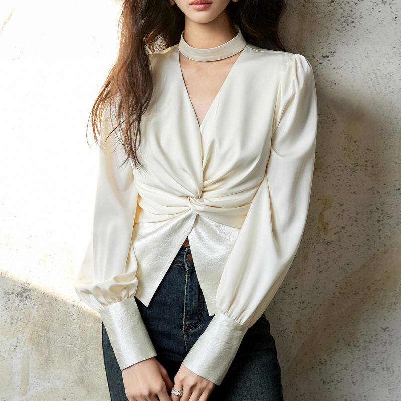 Age-reducing and elegant new V leader women's shirt with fungus edge