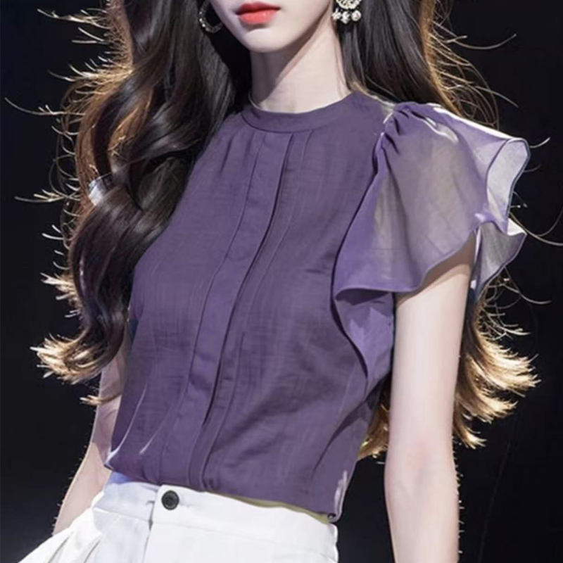 French lotus leaf flying sleeve purple pullover short-sleeved blouse