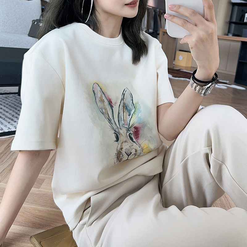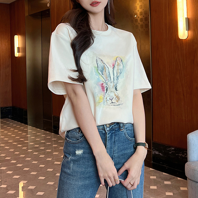 Hand-painted rabbit pattern printed short-sleeved women's t-shirt