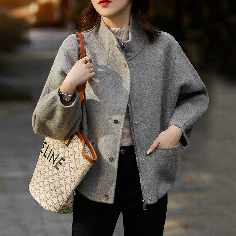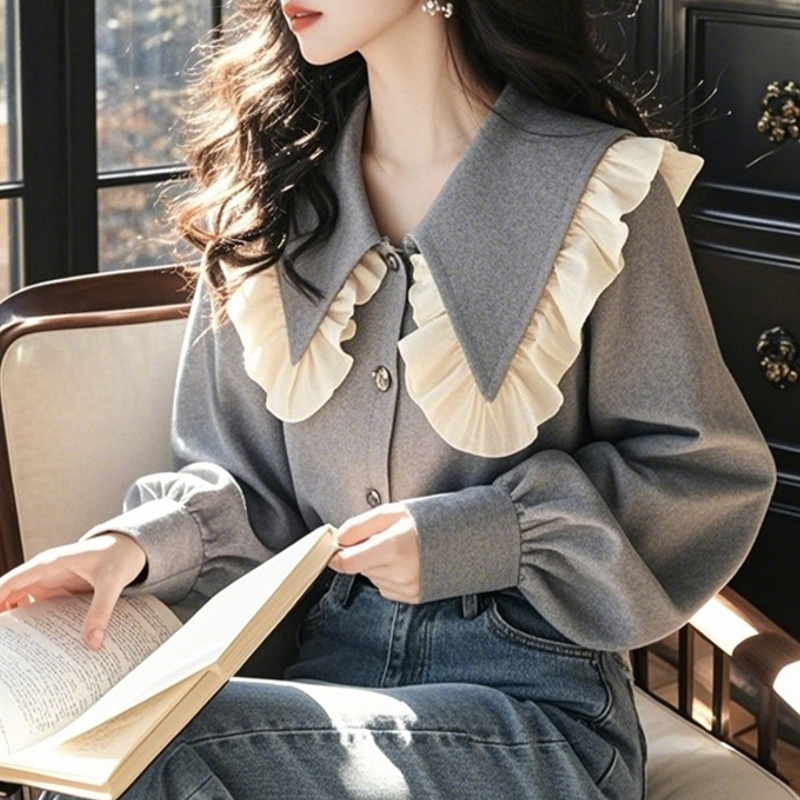 Design sense of gray sleeve blouse with fungus edge and contrasting color