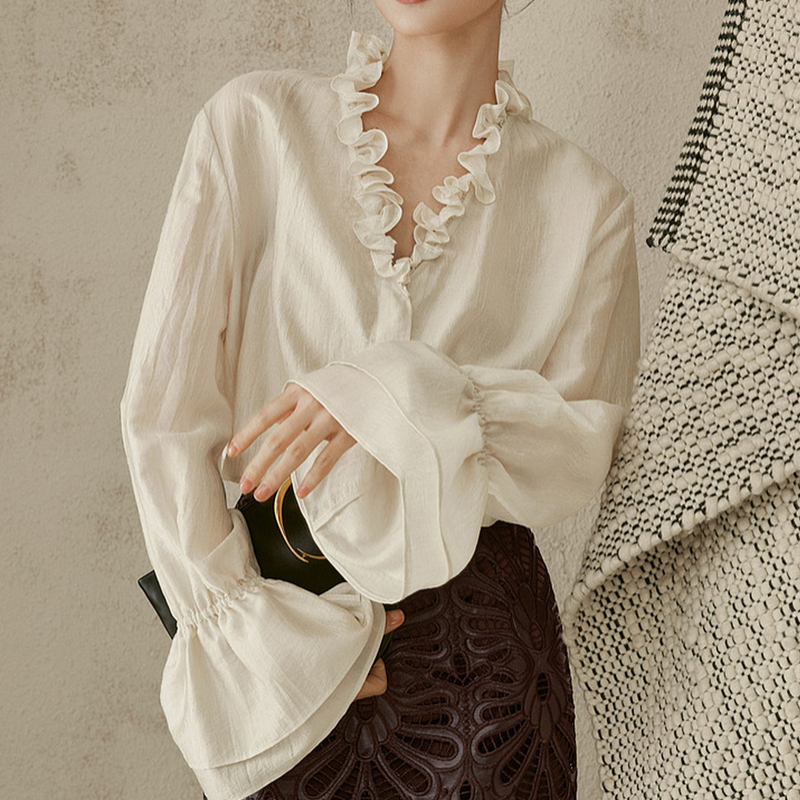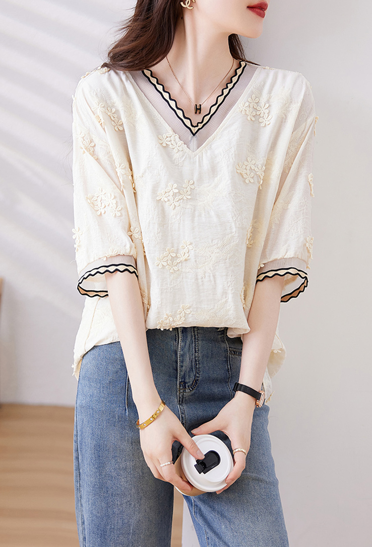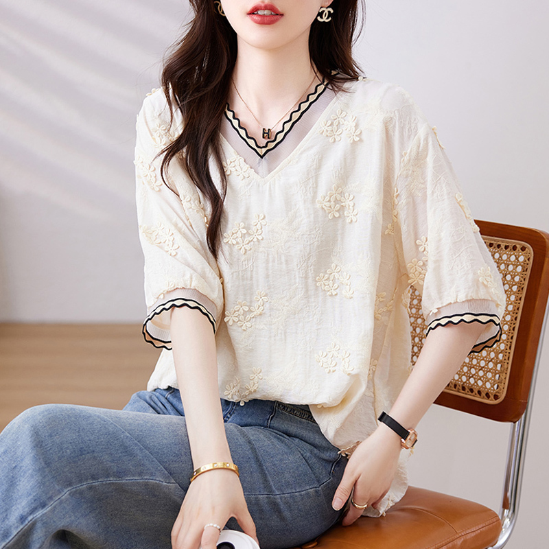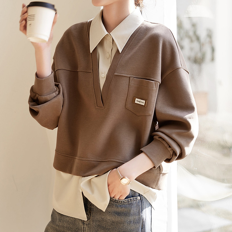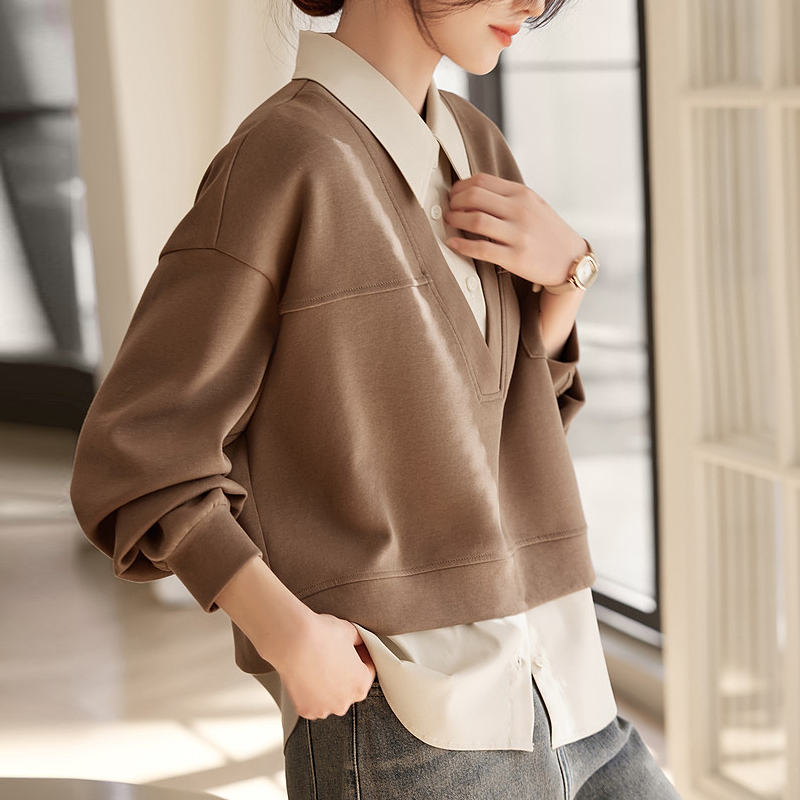 Age-reducing fungus rimmed V-neck loose and lazy new style women's shirt with sleeves