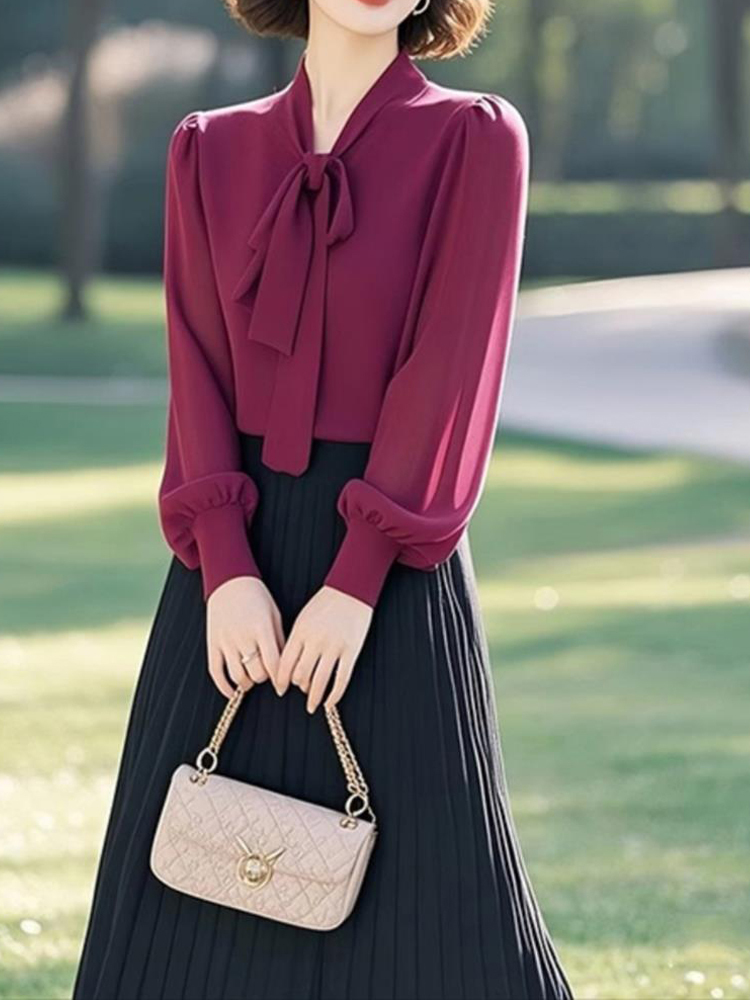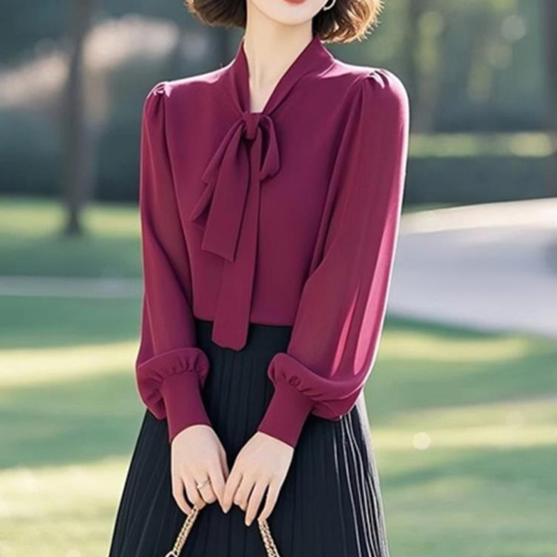 Elegant silk bow wine red new style sleeve blouse