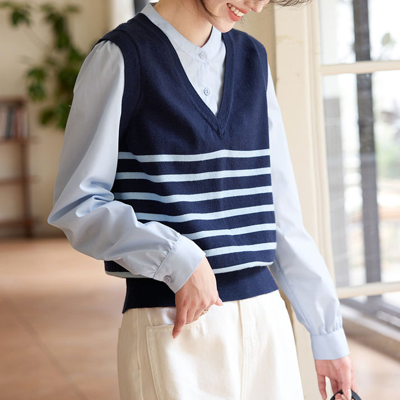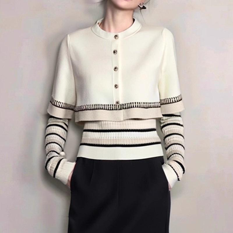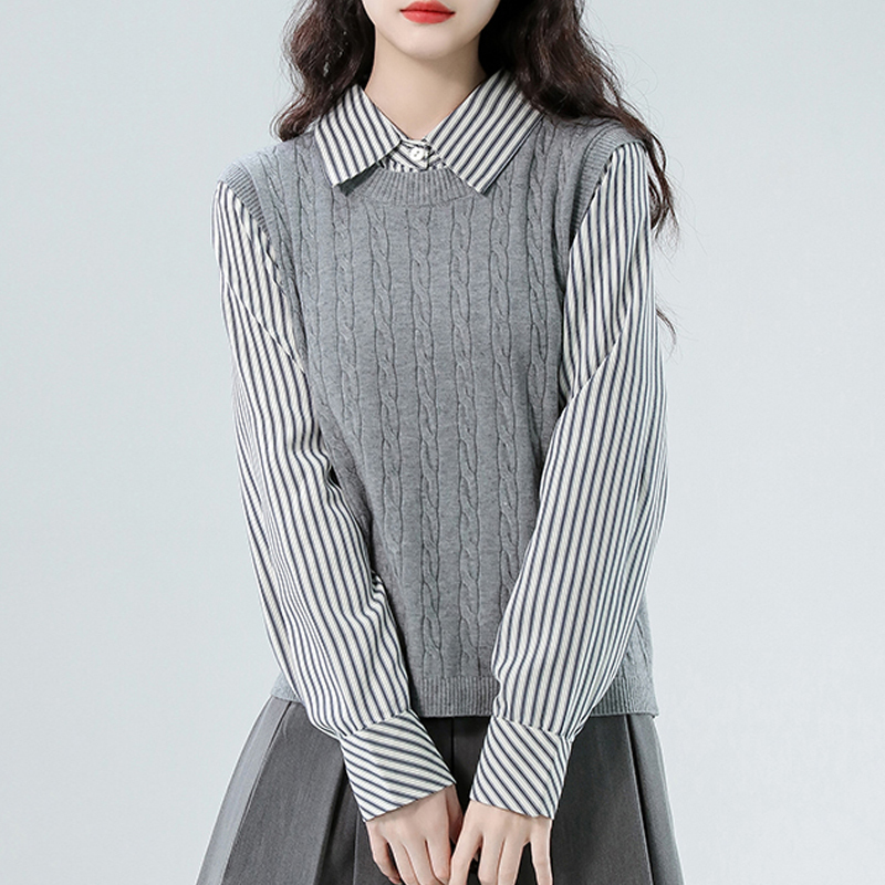 New preppy style stripe stitching fake two-piece women's knitted top