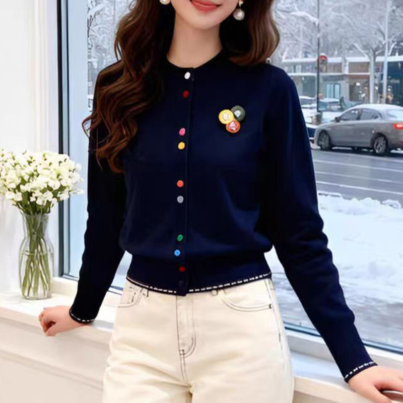 Autumn and winter design, colorful buttons, navy blue sleeves, women's sweater