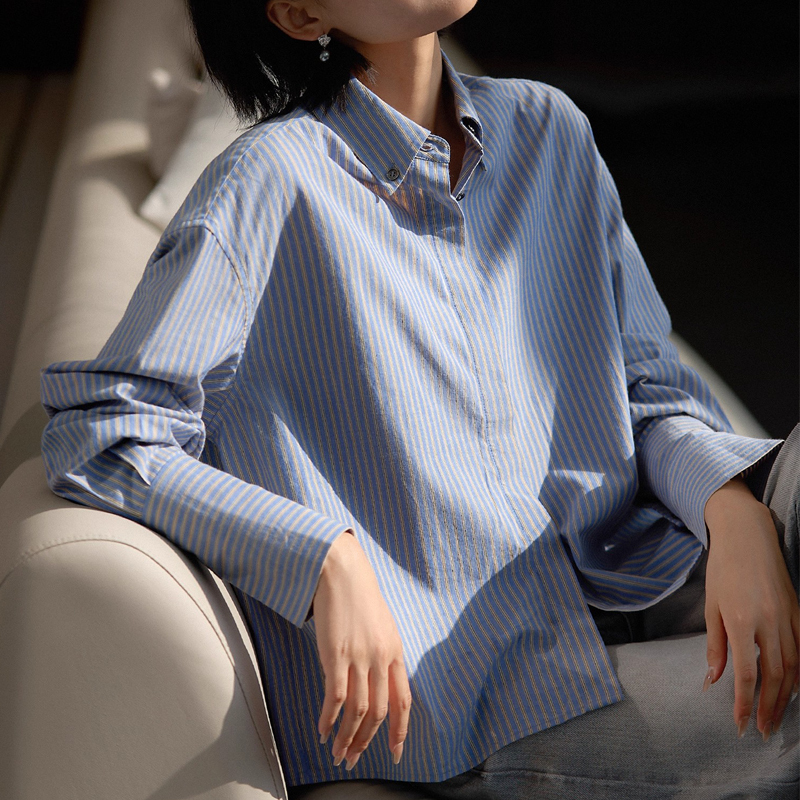 New style blue vertical stripe loose short sleeves women's shirt top