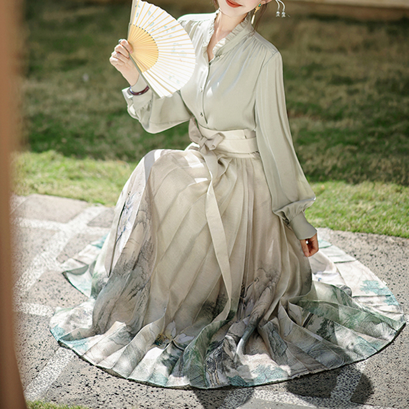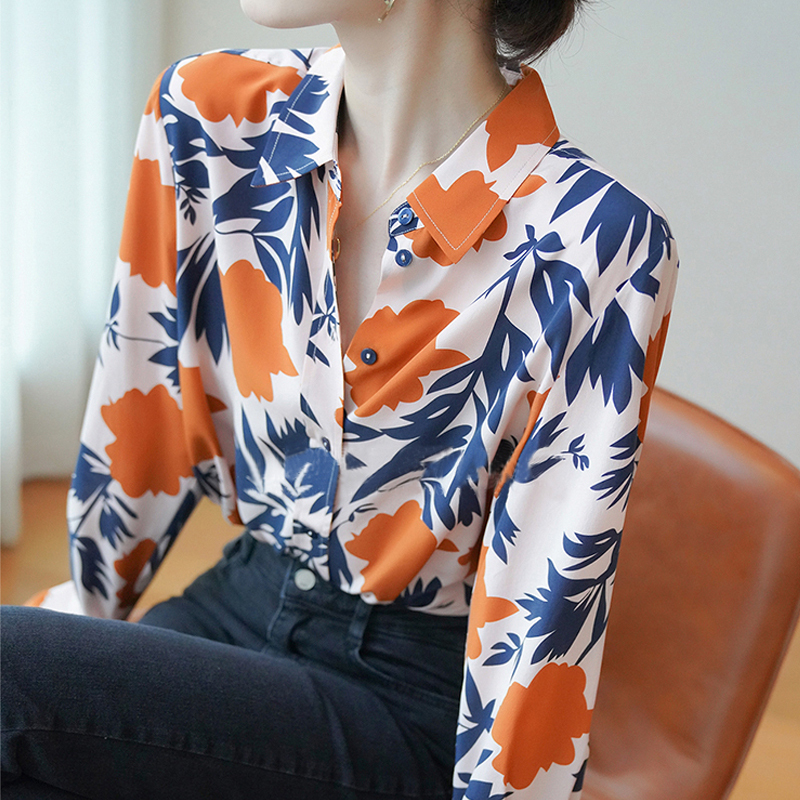 Elegant silk gray blue style new spring sleeve blouse