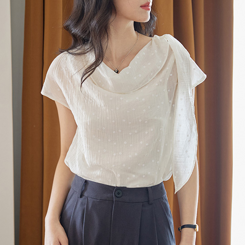 Design sense swing collar shawl pullover white embellishment short-sleeved shirt