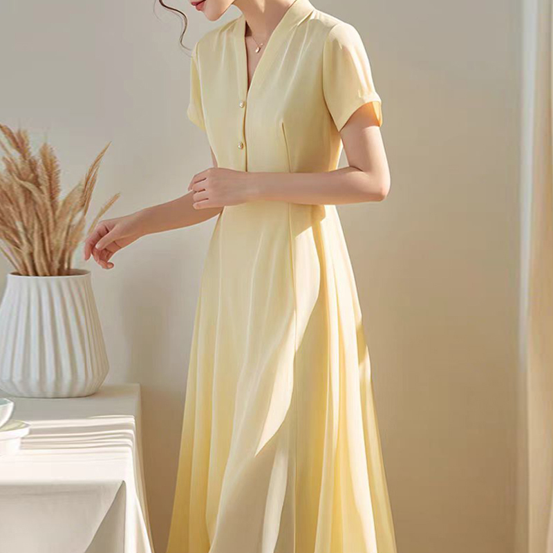 Simple temperament yellow V-neck shirt skirt short-sleeved dress