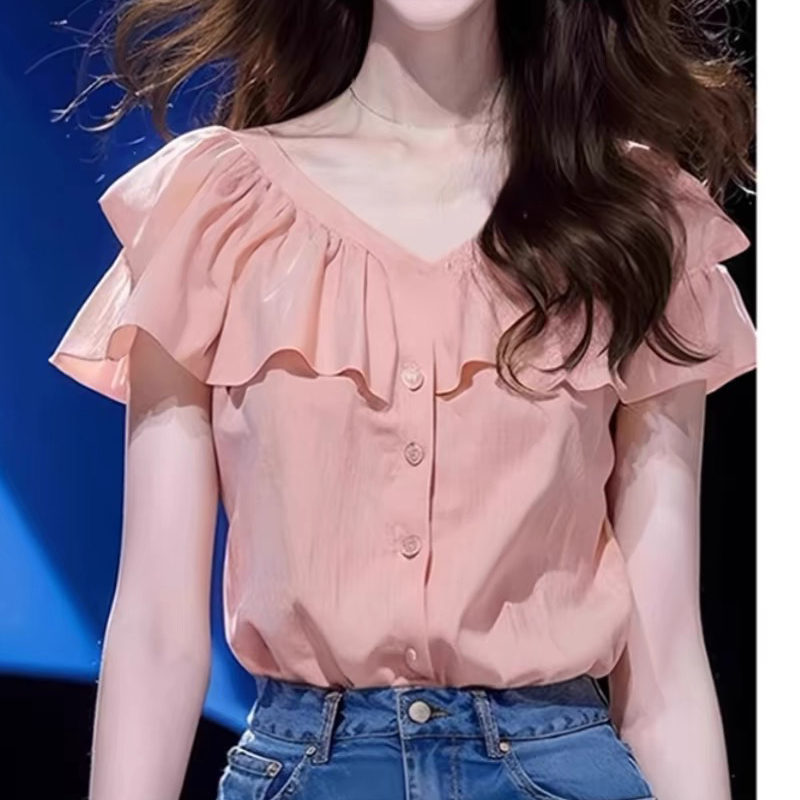 Pink ruffled flying sleeves new short-sleeved women's shirt