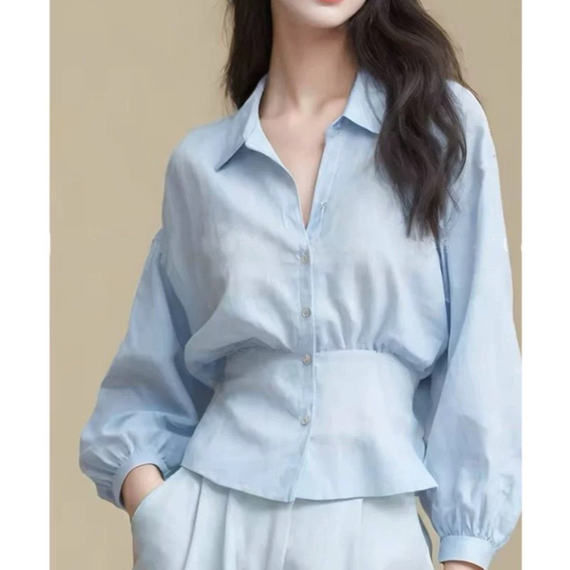 Blue short waist waist pinching high-end sleeve blouse