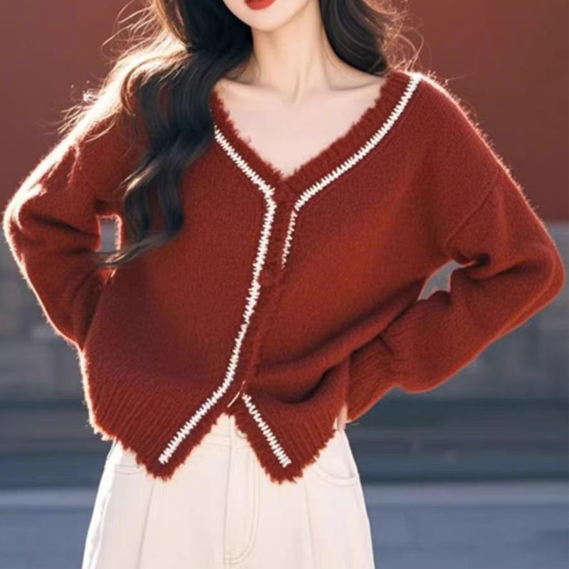 Red contrasting V-neck short lazy autumn and winter women's sweater