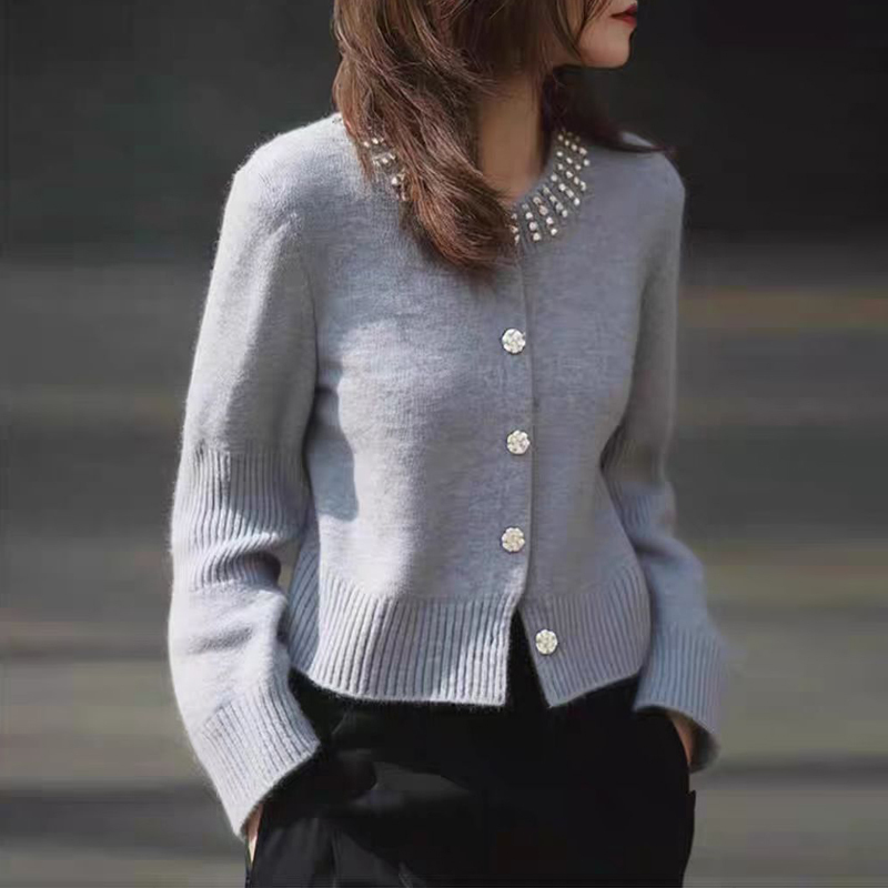 Design beaded age-reducing short gray sleeve women's sweater