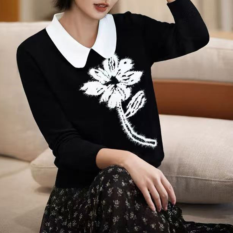 Black and white contrasting lapel embroidery pullover autumn and winter sleeves women's sweater