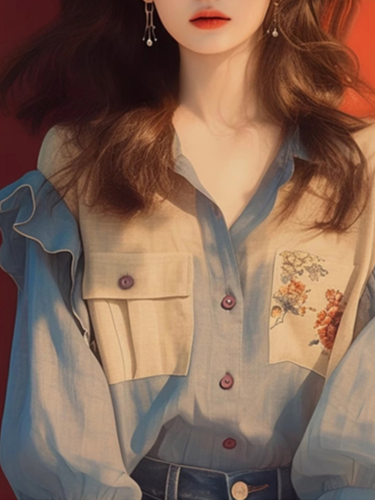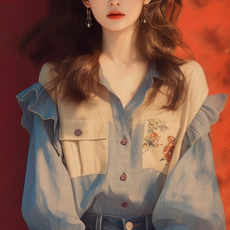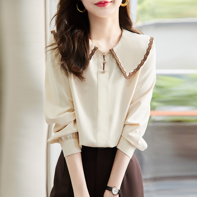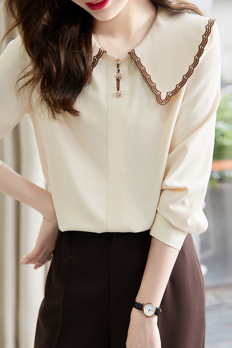 Elegant collision color embroidered collar apricot shirt