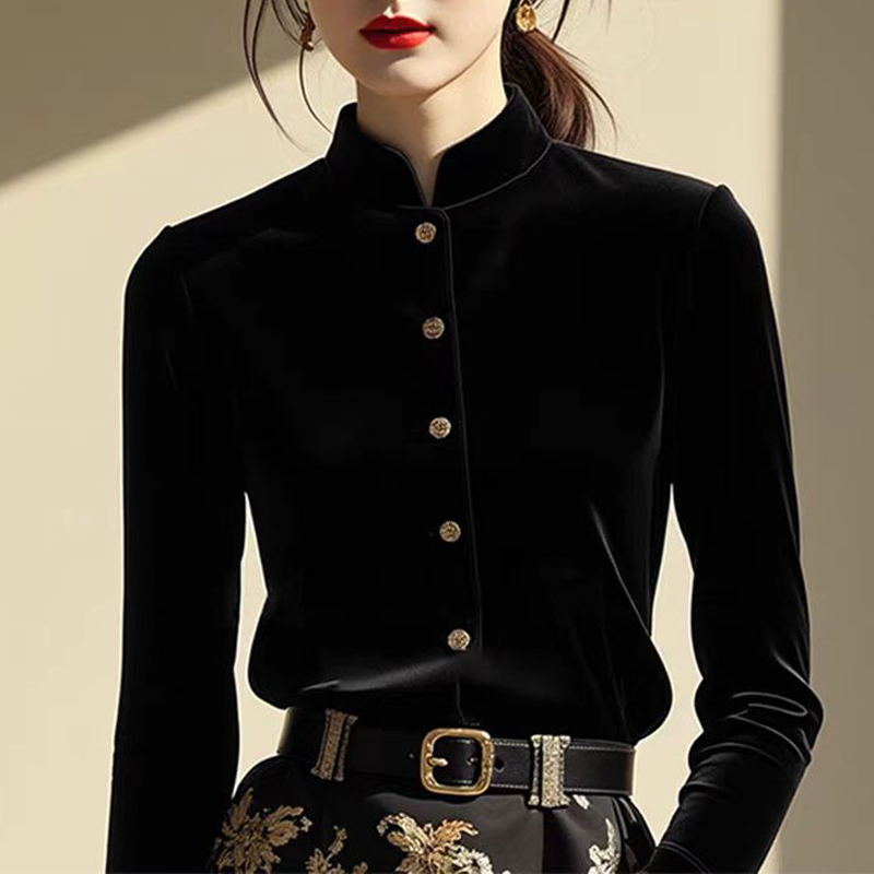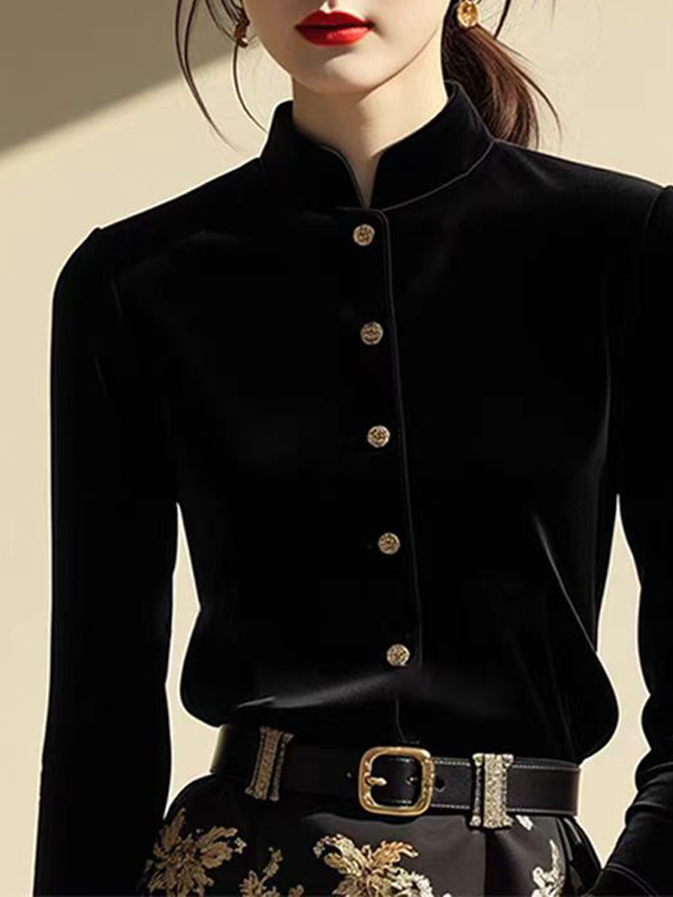 Retro national style small stand collar black sleeve velvet blouse