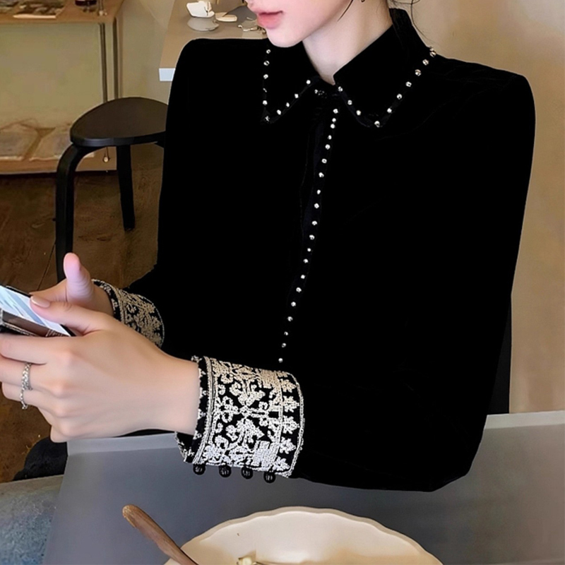 Autumn and winter black velvet stitching high-end sleeve blouse