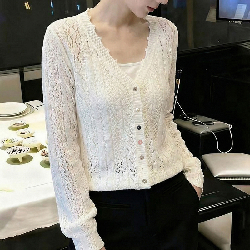 White knitted hollowed-out color breasted sleeve blouse