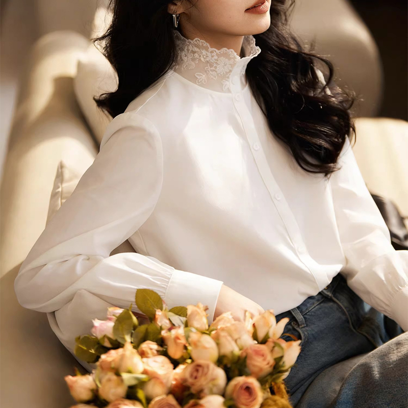 Elegant lace stitching neckline gentle white sleeve women's shirt