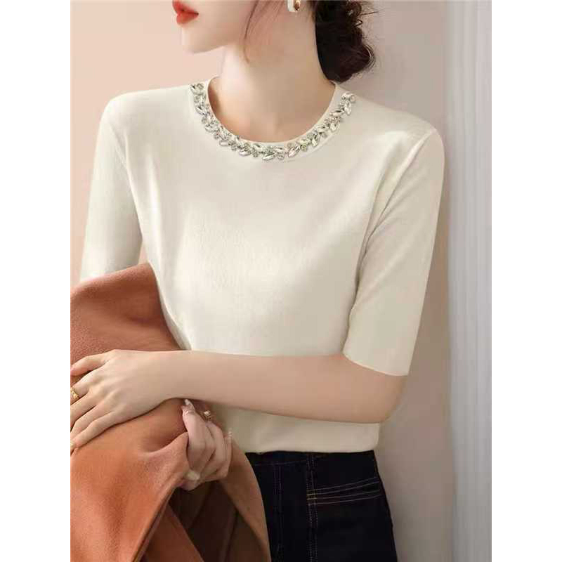 Design sense diamond-encrusted neckline pullover short-sleeved women's sweater top