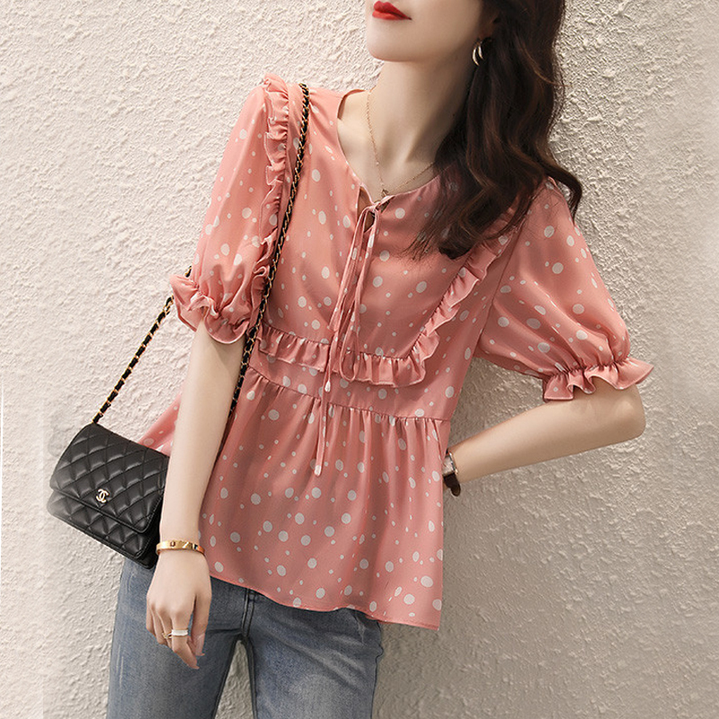 Auricularia auricula lace-up pink wave spot blouse