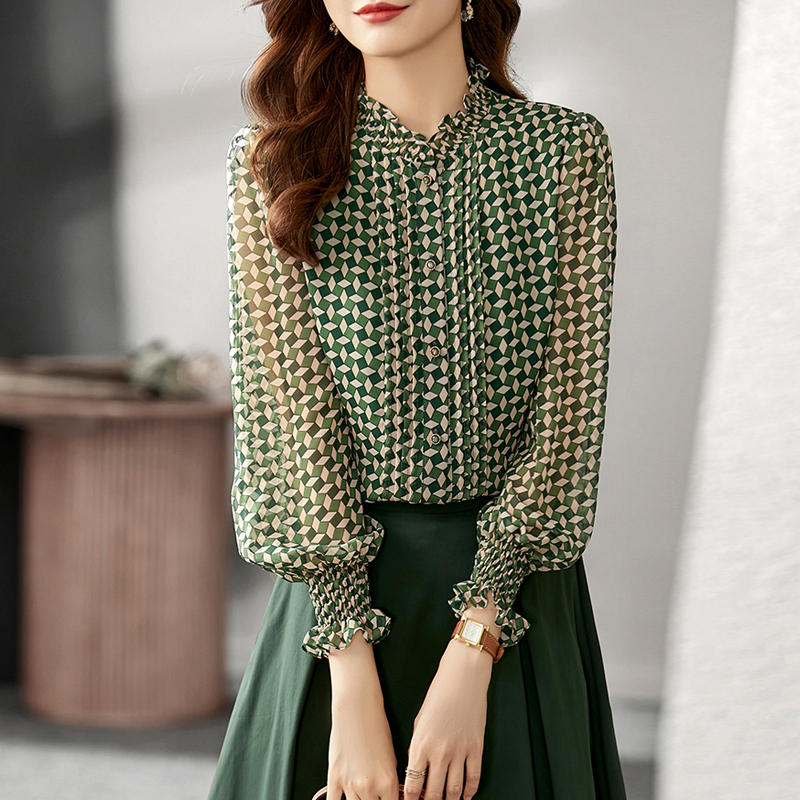 Long-sleeved shirt with green plaid single-breasted button on the edge of agaric