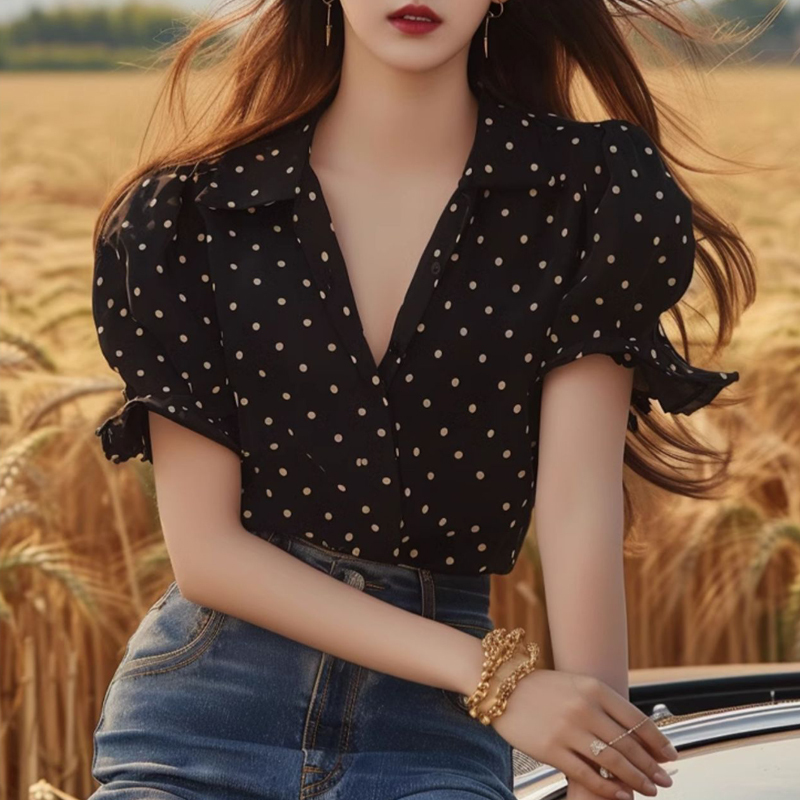 Black polk-dot V-neck fungus sleeve short-sleeve shirt