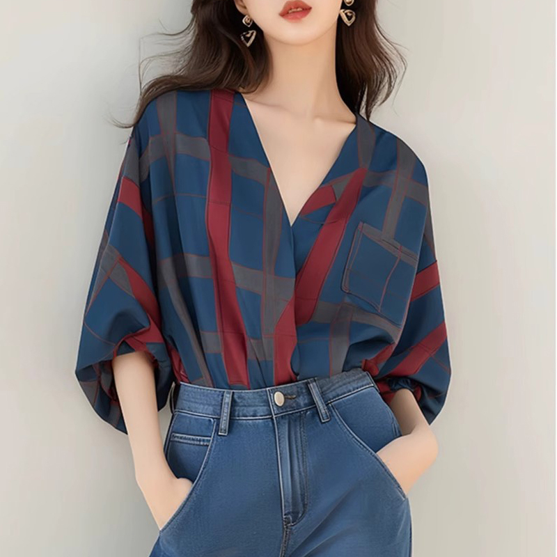 Early autumn seven-quarter sleeve V-neck large plaid top and blouse