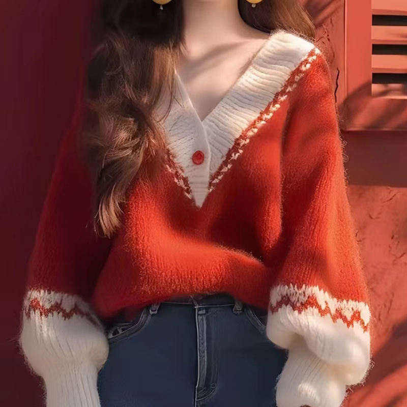 Contrasting color lazy red lantern sleeve pullover sweater