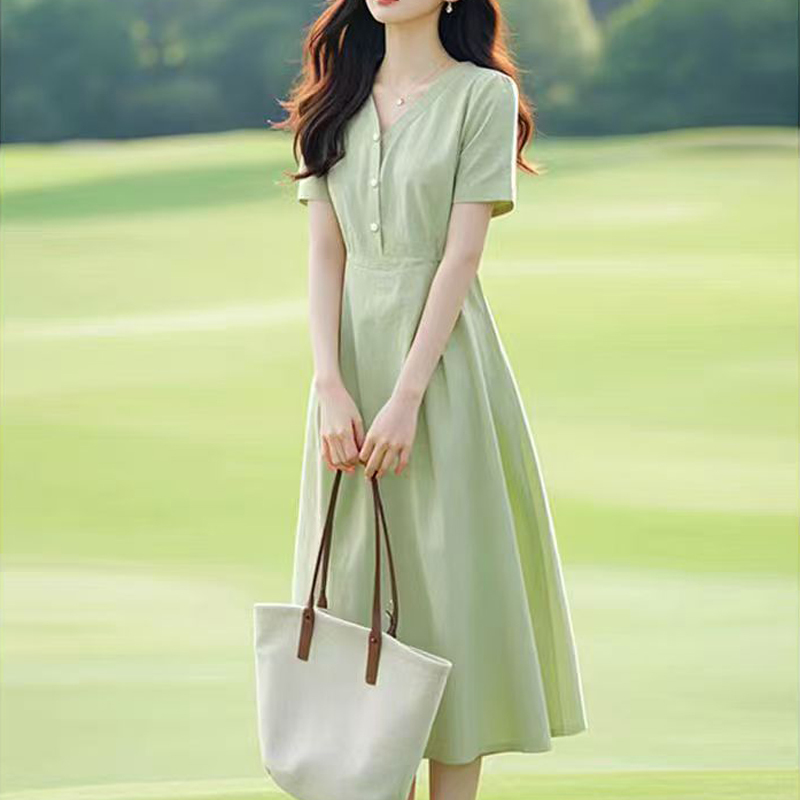 Summer new dress, green V-neck, waist, short-sleeved shirt dress